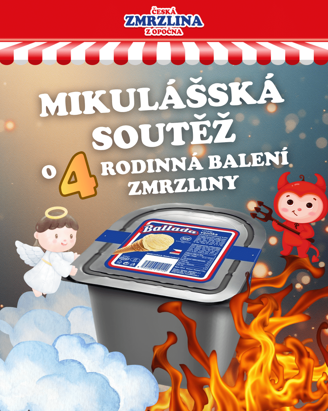 Ať už jste duchem čertík nebo andílek, naše Mikulášská soutěž potěší každého milovníka zmrzliny! Máme pro vás připravena 4 rodinná balení lahodné zmrzliny značky Ballada, která je součástí České zmrzliny z Opočna!